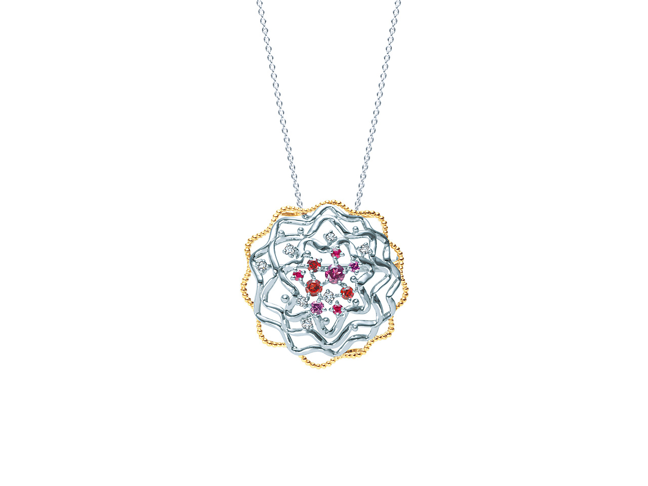 花芯にはルビーやガーネット、ダイヤモンドを精緻にセッティング。ブラウンやベージュなどダークトーンの秋冬のファッションに、一点投入するだけで装いを華やかにしてくれます。ネックレスはチェーンを外して、ブローチとしても着用できます。